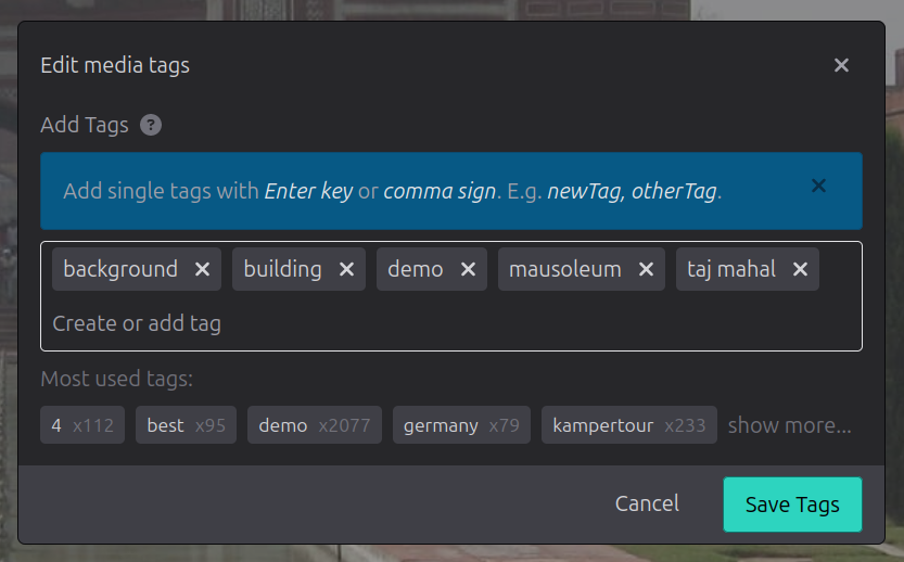 In the edit dialog you can add comma separated tags to the selected images. A minus prefix removes a tag.